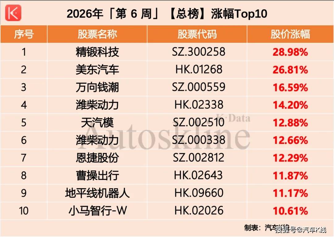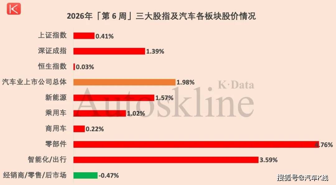 正在这一买卖周,中国汽车业上市公司呈现出了一个耐人寻味的现象,概念落地取本钱运做正正在代替纯真的保守基盘,成为公司获得价值沉估的主要砝码。2026年第6周,《汽车K线只汽车股,股价平均上涨1。98%,扭转了前期持续两周下跌的颓势,景气宇回升。此中,除经销商/零售/后市场板块微跌0。47%外,乘用车、商用车、零部件、新能源和智能化/出行五大板块,均录得分歧幅度上涨;表示最凸起的当属零部件板块,涨幅达到4。76%。