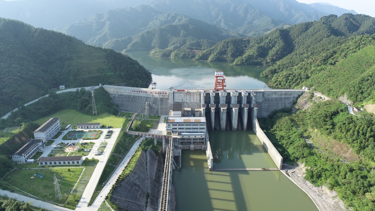 从空中俯瞰,落久水利枢纽工程如巨龙横卧融水贝江下逛,将一江奔涌稳稳托成如镜平湖。初春的阳光温柔洒落,水面波光粼粼,像是万点碎金腾跃。